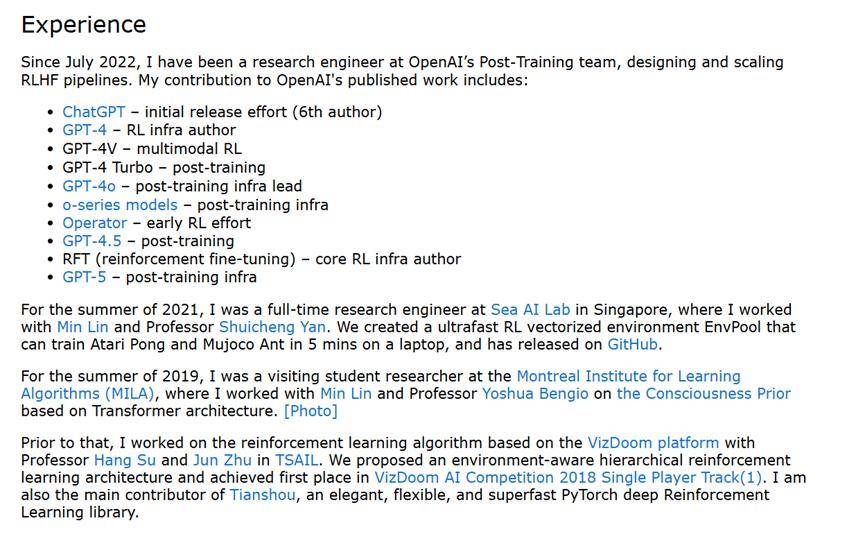 另外,当时OpenAI正在全力推进强化学习人类反馈技术研发,这和他在天授框架里积累的经验完美契合,能让他把强化学习技术用到亿级用户的产品上。